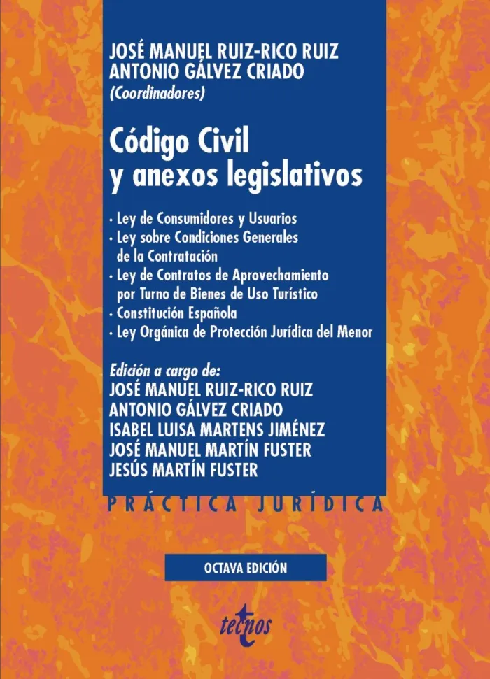 La presente edición ofrece los textos completos y actualizados de la siguiente normativa: - Código Civil español (Real Decreto de 24 de julio de 1889). - Texto Refundido de la Ley de Consumidores y Usuarios (Real Decreto Legislativo 1/2007, de 16 de noviembre, por el que se aprueba el Texto Refundido de la Ley General para la Defensa de los Consumidores y Usuarios y otras ley...