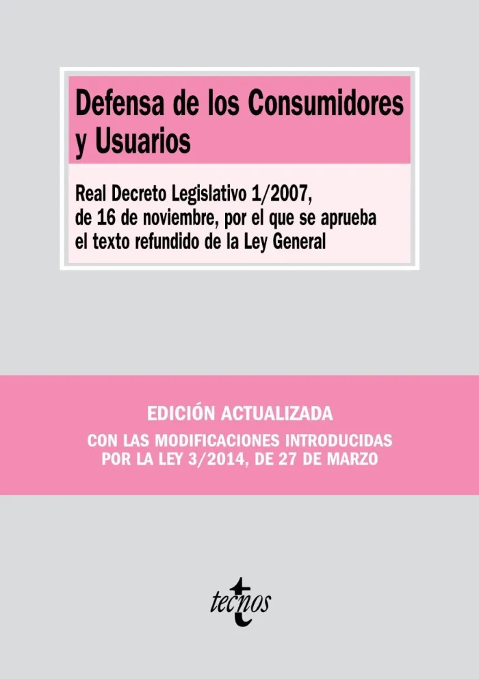 Esta edición ofrece el Real Decreto Legislativo 1/2007, de 16 de noviembre, por el que se aprueba el texto refundido de la Ley General para la Defensa de los Consumidores y Usuarios y otras leyes complementarias, con todas las modificaciones que hasta ahora ha tenido, introducidas por la Ley 25/2009, de 22 de diciembre, de modificación de diversas leyes para su adaptación a la Ley sobre el libre acceso a las actividades de servicios y su ejercicio; por la Ley 29/2009, de 30 de diciembre, por la que se modifica el régimen legal de la competencia desleal y de la publicidad para la mejora de la protección de los consumidores y usuarios; y, sobre todo, por la Ley 3/2014, de 27 de marzo, por la que se modifica el texto refundido de la Ley General para la Defensa de los Consumidores y Usuarios y otras leyes complementarias. En apéndice se incluye el contenido de esta última Ley como información complementaria de los importantes cambios producidos a raíz de la Directiva comunitaria 2011/83/UE y de la Sentencia del Tribunal de Justicia de la Unión Europea de 14 de junio de 2012.