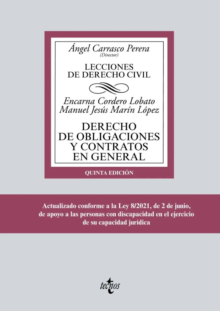 El Derecho de Obligaciones y Contratos en general pretende ser un texto de referencia tanto para estudiantes de Grado en Derecho, como para profesionales, sean o no jurídicos. A diferencia de los manuales al uso, se trata de una obra que sintetiza lo esencial de la materia, facilitando su asimilación a través de la peculiar estructura y ordenación de las lecciones. Precedidas de un breve cuadro normativo, las ideas fundamentales de cada lección se exponen en epígrafes independientes, acompañadas de cuadros dedicados a tratar cuestiones controvertidas de interés, y cada lección termina con un compendio de las reglas fundamentales que han sido expuestas. La obra constituye el instrumento más completo, actualizado y útil para conocer lo fundamental del Derecho de Obligaciones y Contratos en general, comprendiendo el concepto y clasificación de los contratos, sus elementos esenciales y accidentales, su formación, eficacia e ineficacia, su interpretación, así como la noción de obligación y de relación obligatoria, las fuentes de las obligaciones, su clasificación, modificación y extinción, el incumplimiento de las obligaciones, la afección del patrimonio al cumplimiento, las garantías de la obligación y los medios de tutela y protección del crédito.