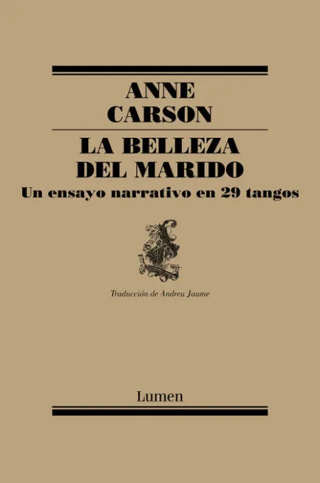 La locura al cuadrado es matrimonio.» La belleza del marido, el primer libro que se publica en España de la canadiense Anne Carson, es una de las más originales y turbadoras manifestaciones de la poesía de nuestros días. Subtitulado «un ensayo narrativo en 29 tangos», este libro inclasificable cuenta la historia de un matrimonio en torno a la idea de Keats «beauty is truth», belleza es verdad. A lo largo de estos 29 tangos -un tango, como el matrimonio, es algo que uno tiene que bailar hasta el final-, Anne Carson, considerada ya un clásico vivo de las letras anglosajonas, nos introduce en la historia íntima de un matrimonio que se desmorona. Iluminador, a menudo brutal, conmovedor y oscuramente divertido, este libro nos deslumbra con escenas, diálogos y reflexiones que ahondan en la más vieja de las preocupaciones poéticas -el amor- como si fuera la primera vez que se expresa. Reseñas: