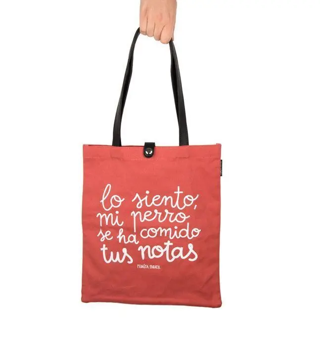 Bolso de loneta vaquera rosa con asas de polipiel y con la frase ilustrada "Lo siento, mi perro se ha comido tus notas" de Pedrita Parker. ...