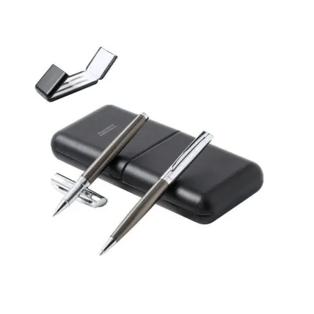 Set premium de bolígrafo y roller. Fabricado en elegante combinación de metal en tonos negros y cromados. Bolígrafo de mecanismo giratorio en tinta azul y con cartucho jumbo. Roller con capucha y tinta gel en azul, carga jumbo. Presentado en estuche individual de polipiel con interior en contraste de antelina en blanco.