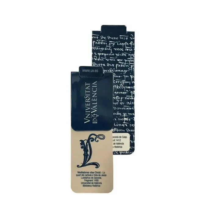 Marcapáginas imantado en cartulina con ilustraciones de la Biblioteca Histórica de la Universitat de València15-10 x 3,5 cmReferencias Biblioteca Histórica de la Universitat de València:Meditationes vitae Christi - Lo quart del cartoxà o Vida de Jesús Ludosphus de Saxonia - Fragment 1495Diari del Compromís de CaspManuscrit 1412 ...