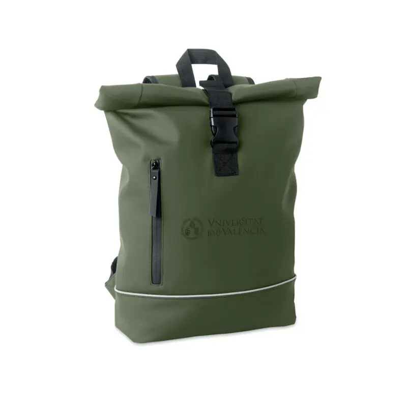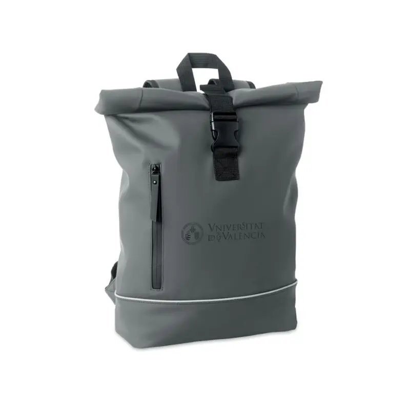 Escudo UV grabadoMochila con cierre rolltop para portátil de 15'' en suave PU con respaldo acolchado y refuerzo en la base con banda reflectante. Bolsillo frontal impermeable con cremallera. Forro de poliéster RPET 210D. ...
