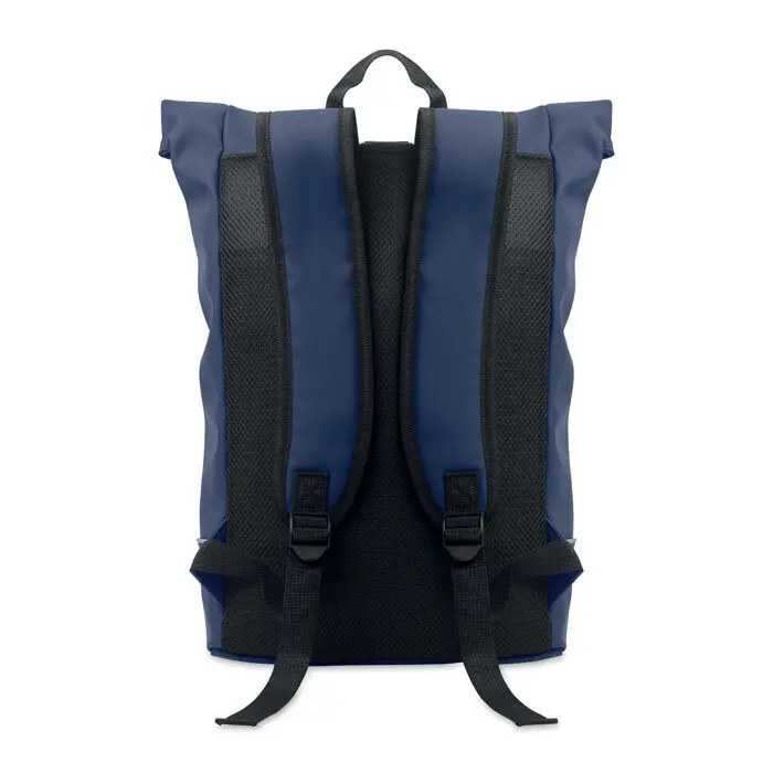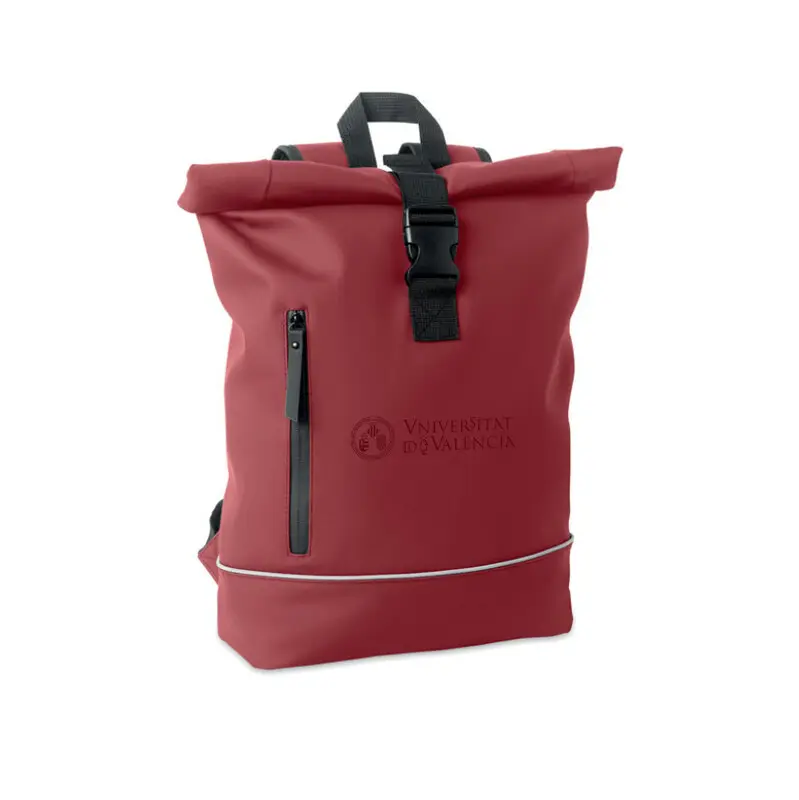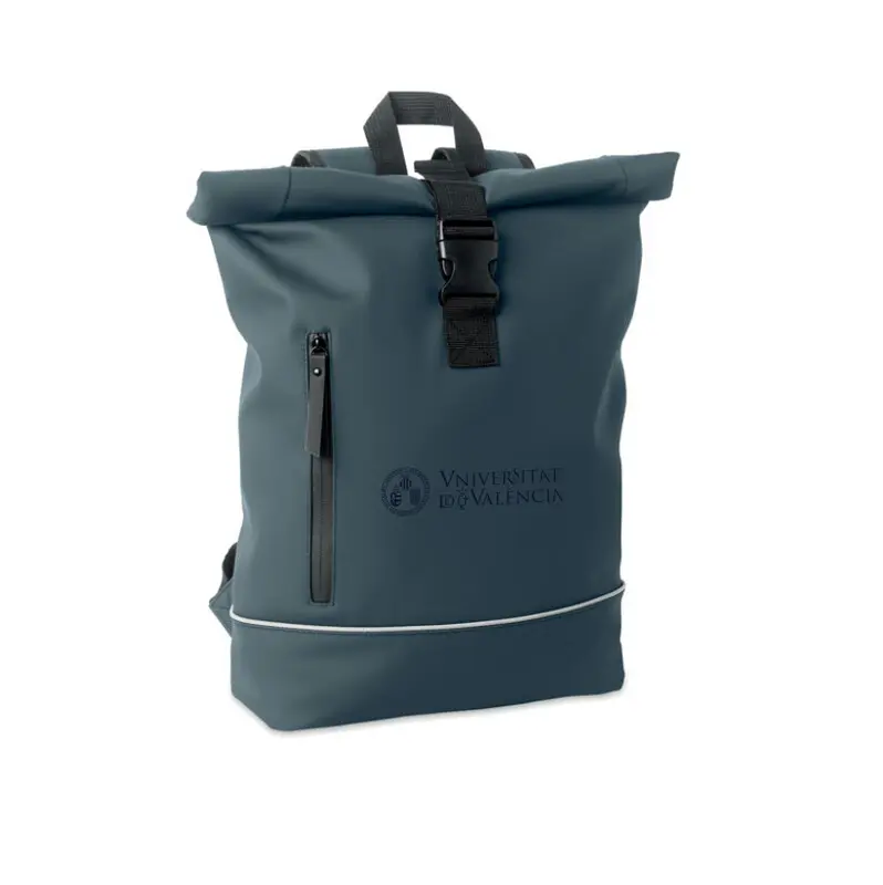 Mochila con cierre rolltop para portátil de 15'' en suave PU con respaldo acolchado y refuerzo en la base con banda reflectante. Bolsillo frontal impermeable con cremallera. Forro de poliéster RPET 210D.