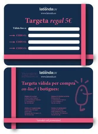 Tarjeta regalo Diseño Escudo o Xano con diversos importesTe enviaremos por mail la/s tarjeta/s en formato pdf con el código para utilizarla tanto en compras on-line como en tiendasSi necesitas otro importe escríbenos a latenda@uv.es ...