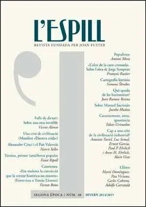 Editorial: Joan Fuster i L'Espill Xavier Pla, Fuster i els gossos. Tres reflexions sobre assagisme català i cinisme Antoni Furió, De la literatura i la cultura a la política Gustau Muñoz, Llegir Fuster al segle XXI Joan Ramon Resina, Joan Fuster: de professió assagista Toni Mollà, Els silencis de Joan Fuster Enric Iborra, Als antípodes de tota forma de genialitat específicamen...