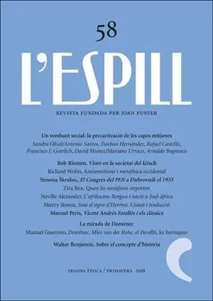 L'Espill 58 presenta un ampli dossier sobre «La precarització de les capes mitjanes», on s'analitza el declivi i la sotragada que el canvi econòmic de començaments del segle XXI ha suposat per a les classes mitjanes tradicionals i professionals dels països occidentals. Aportacions de Sandra Obiol, Antonio Santos, Esteban Hernández, Rafael Castelló, Francisco J. Goerlich, David ...