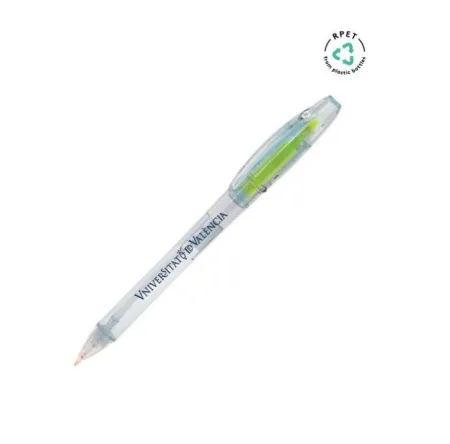 Logotipo Universitat de València impresoBolígrafo marcador flúor. Cuerpo transparente, tinta color azul y marcador amarilloFabricado pet reciclado ...