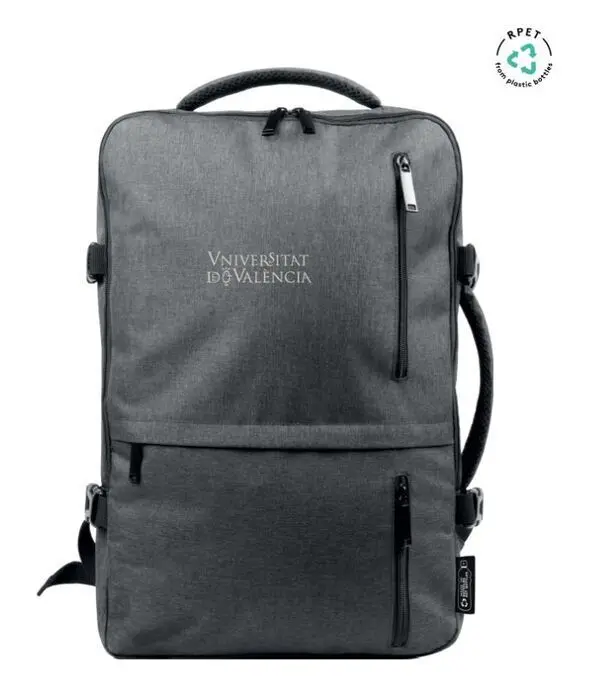 Logotipo Universitat de ValènciaMATERIAL: Poliéster 300D / 50% RPETMEDIDAS: 31 x 46 x 11 cmMochila y maletín de congresos 2 en 1, fabricada en RPET (reciclado) con acabado impermeable y compartimento para ordenador. Dispone de acolchado interior y exterior, con banda de sujeción para trolleys y sujeción de las asas cuando se use como bolsa. Peso máx recomendado 15 Kgs ...