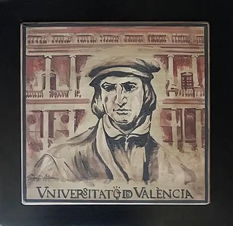 Socarrat elaborado artesanalmente con retrato de Luis Vives y Claustro de la Universitat.